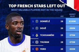 无缘本期法国队球员身价:登贝莱1亿欧最高,杜埃、琼阿梅尼前三