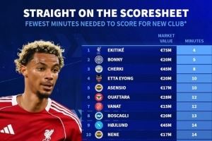 今夏新援最快攻入首球排名:埃基蒂克4分钟居首,博尼5分钟次席